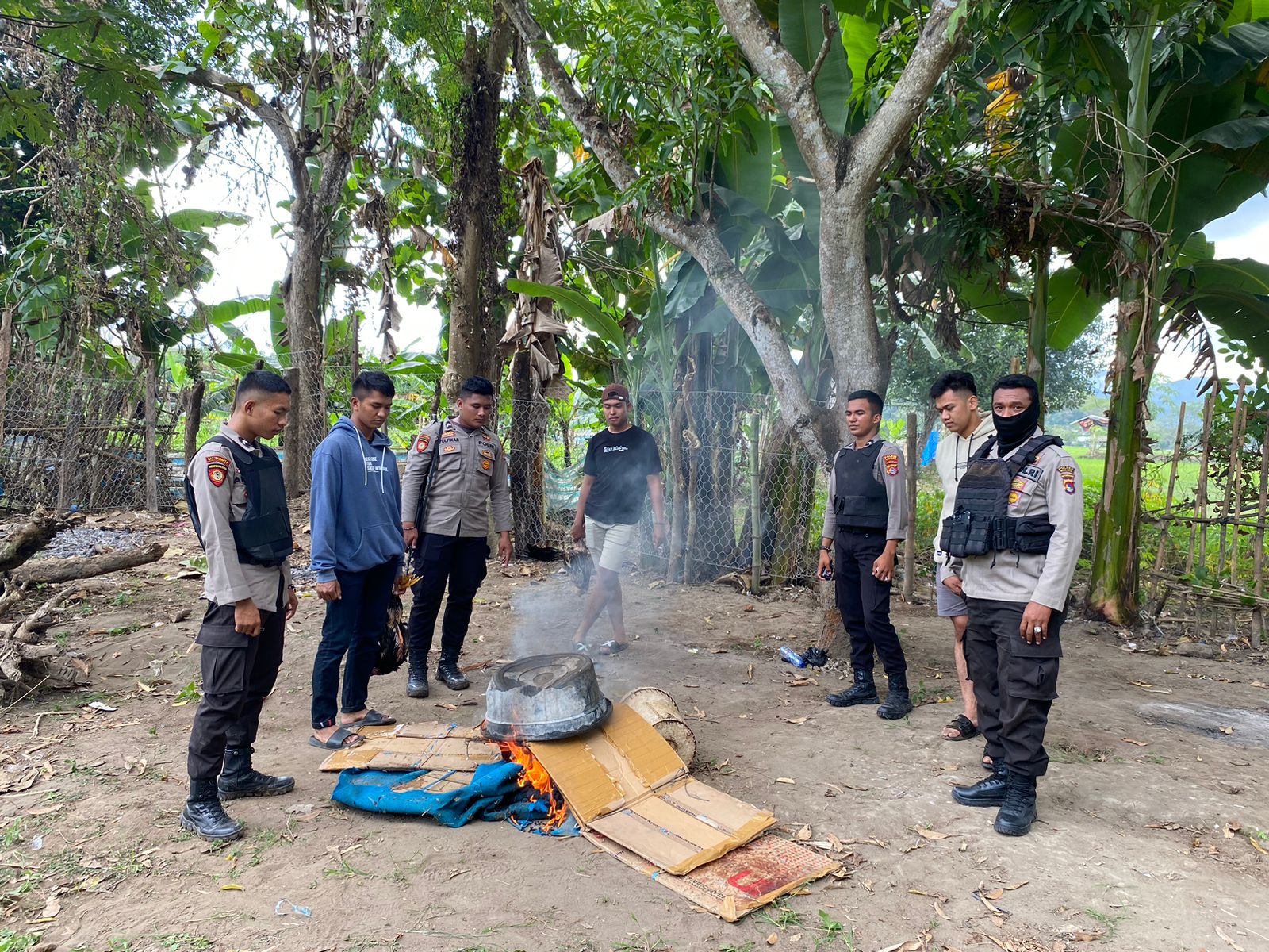 Barang bukti tersebut, urai AKP Jufrin, dua ekor ayam aduan yang langsung digorok, gelanggang aduan yang langsung dimusnahkan di TKP dengan cara dibakar.