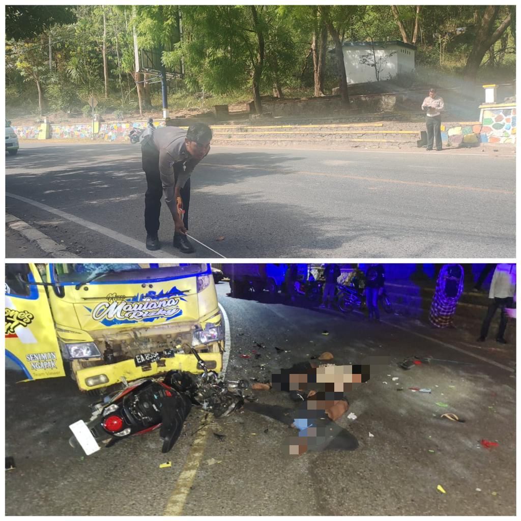 Pada awalnya jelas Kasi Humas, sepeda motor Honda yang melaju dari arah barat menuju kearah timur atau melawan arah dengan kecepatan relatif tinggi saat melewati jalan menikung bertabrakan dengan satu Dum Truk dengan muatan jagung melintas dari arah utara menuju ke arah selatan yang bermuatan jagung.