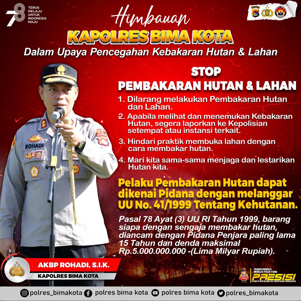 Beberapa poin peringatan dan imbauan yang dikeluarkan Kapolres Bima Kota AKBP Rohadi diantaranya, Dilarang Melakukan Pembakaran HUTAN dan LAHAN