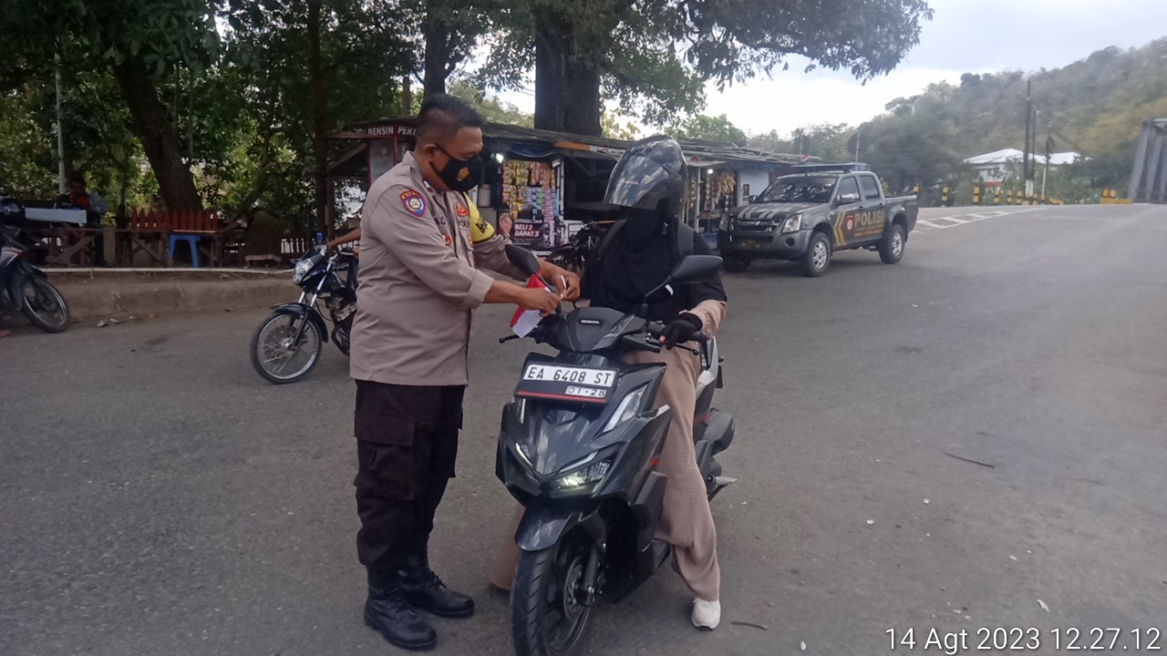 Kota Bima, NTB (15/8) – Sebagai wujud mengenang dan memperingati HUT RI yang ke-78 tahun 2023, Polsek Rastim Polres Bima Kota bagi-bagi Bendera Merah Putih.