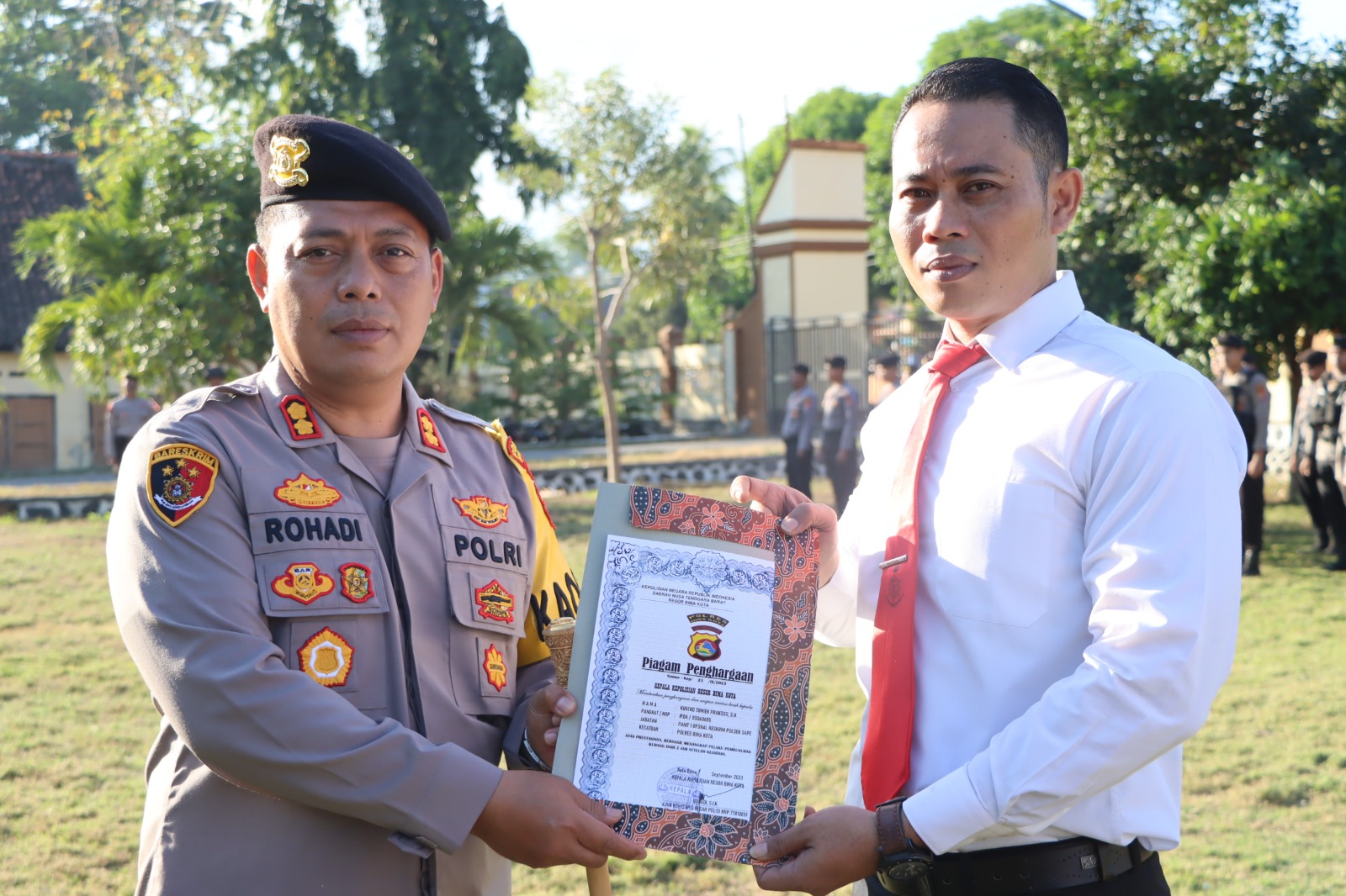 Mewakili Kapolsek Sape, Kanit Reskrim Ipda Kunto Prakoso, menerima penghargaan yang diberikan langsung Kapolres Bima Kota AKBP Rohadi.