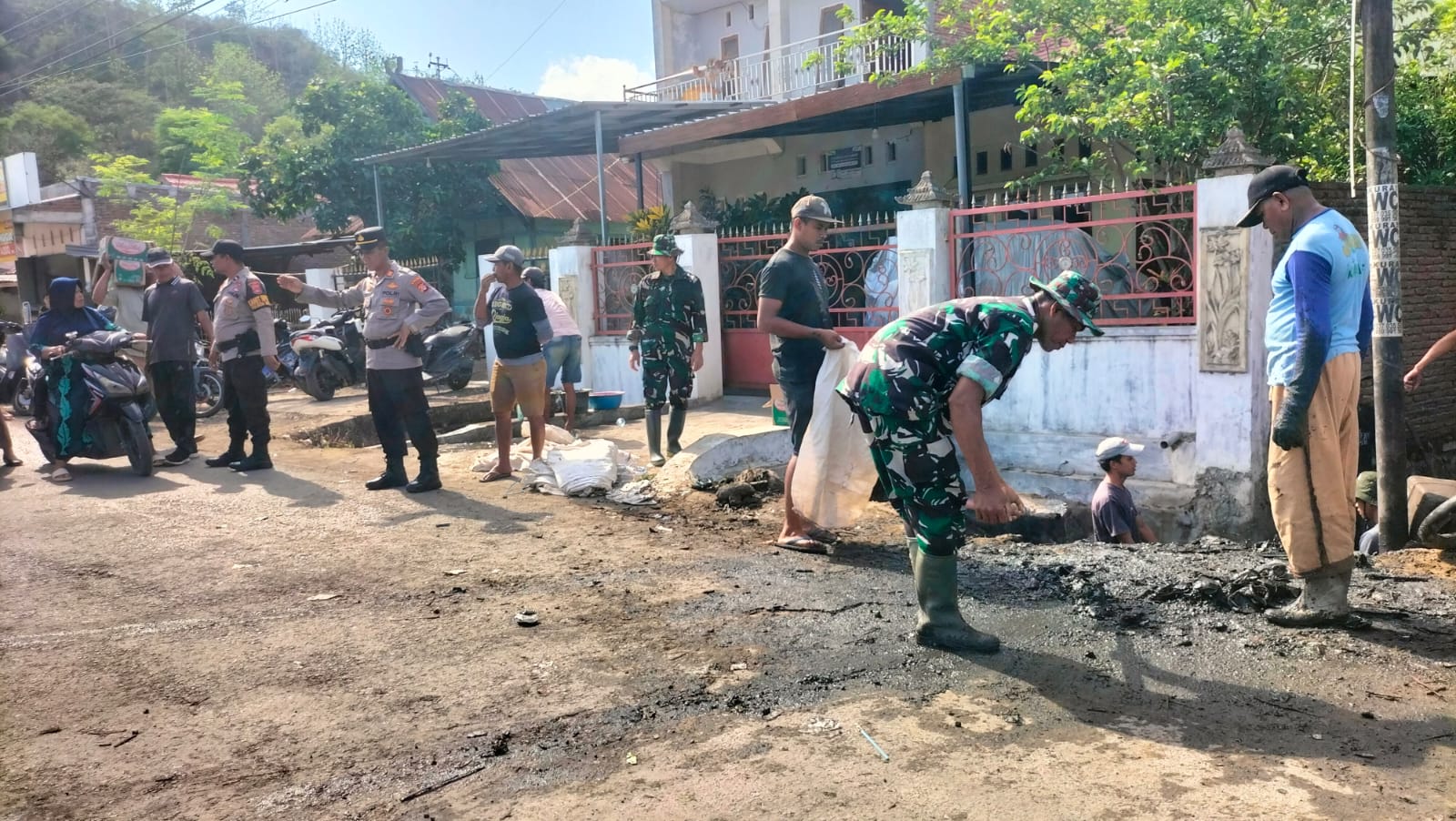 Terlihat personel Polsek Woha dan Koramil Woha bersama warga setempat bahu membahu membersihkan saluran air, tumpukan sampah hingga lumpur yang berada didalam selokan di sepanjang jalan Desa Samili.