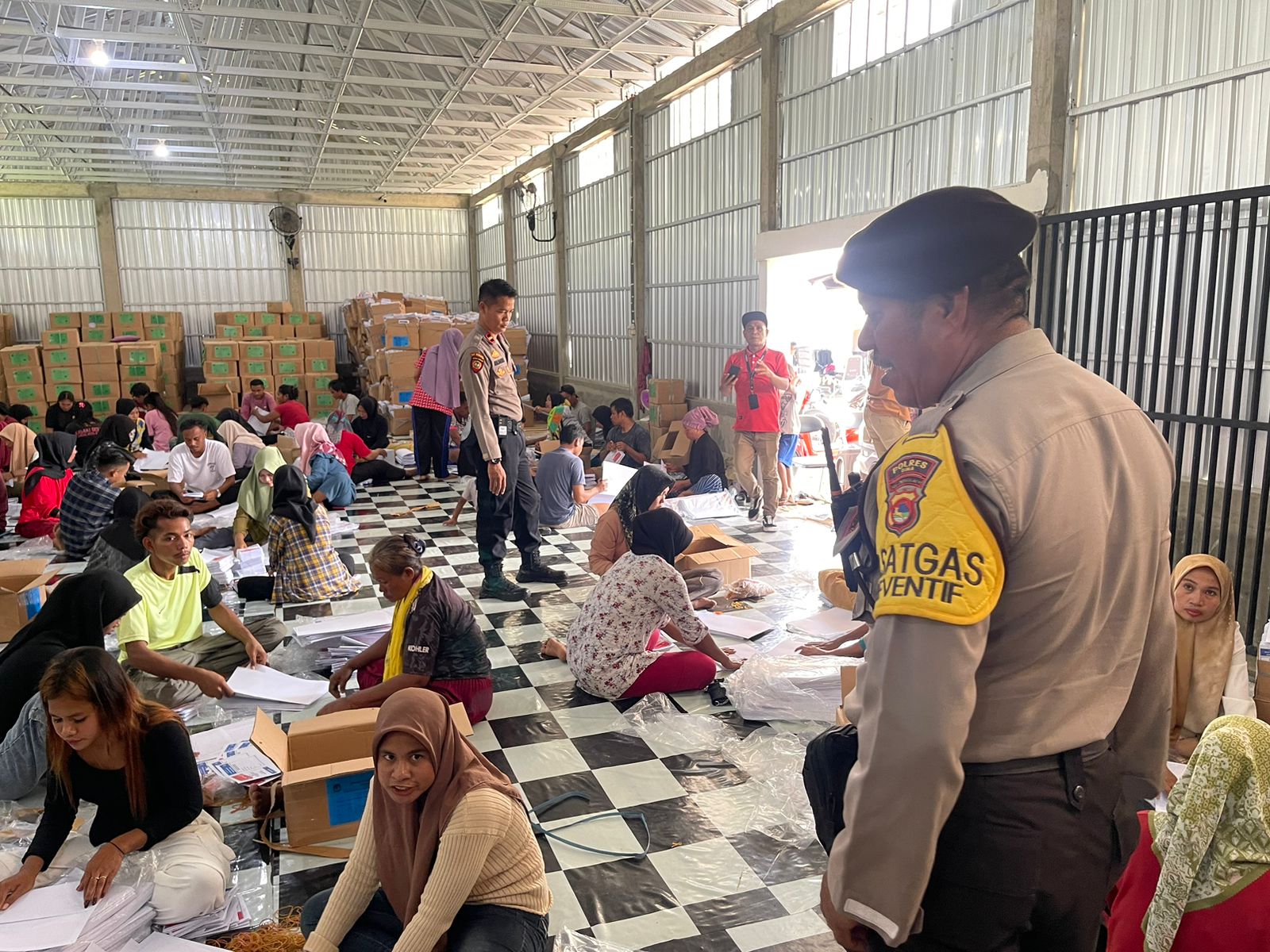 Bima, NTB (9/1) – Meningkatkan pengamanan tahapan Pemilu 2024, Satgas Preventif melaksanakan pengamanan dan pengecekan kepada masyarakat yang dilibatkan dalam pelipatan surat suara di gudang logistik KPU Kabupaten Bima.