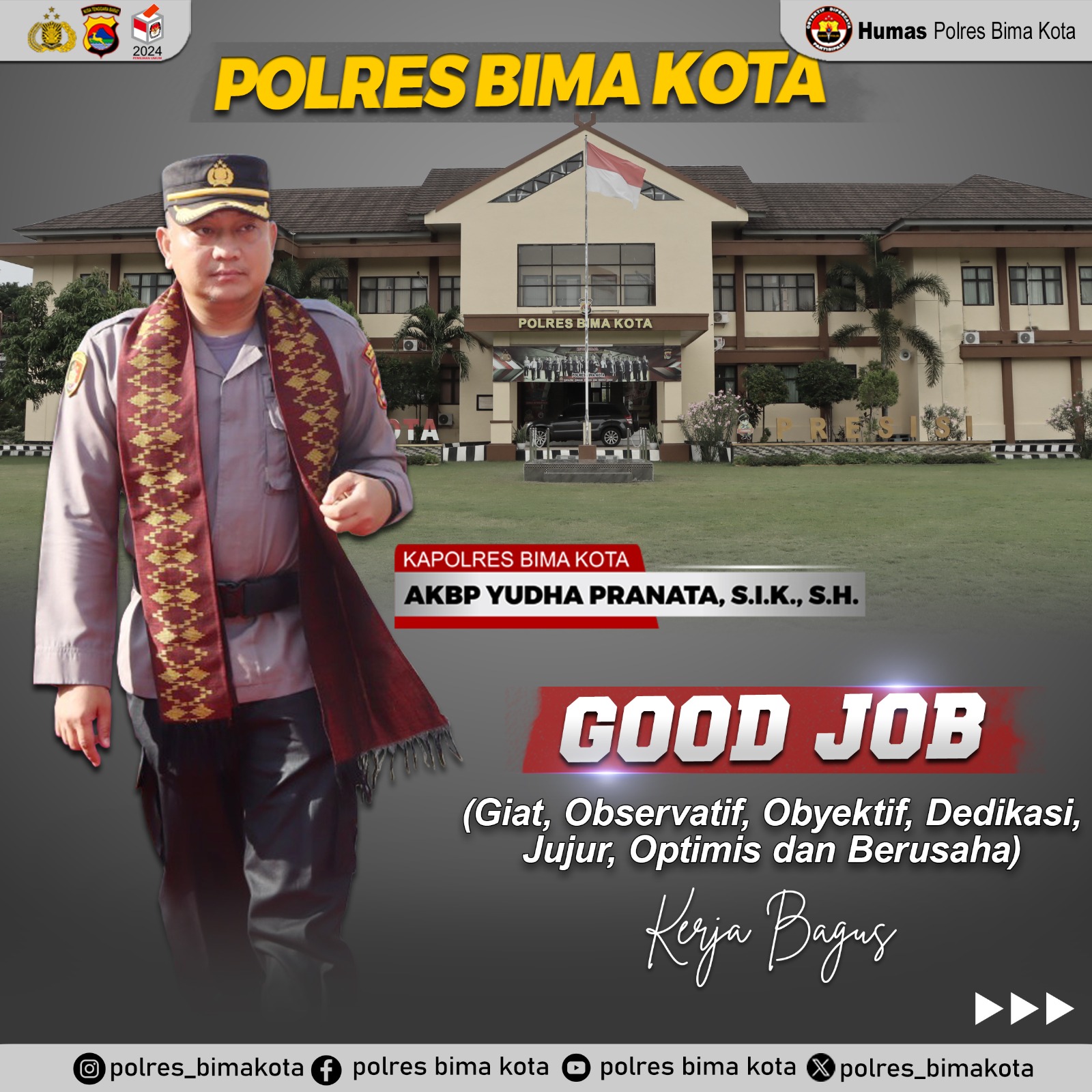 Giat, Observatif, Objektif, Dedikasi, Jujur, Optimis dan Berusaha (GOOD JOB), begitu visi kerja AKBP Yudha Pranata selama menjadi Komandan tertinggi di Polres Bima Kota.