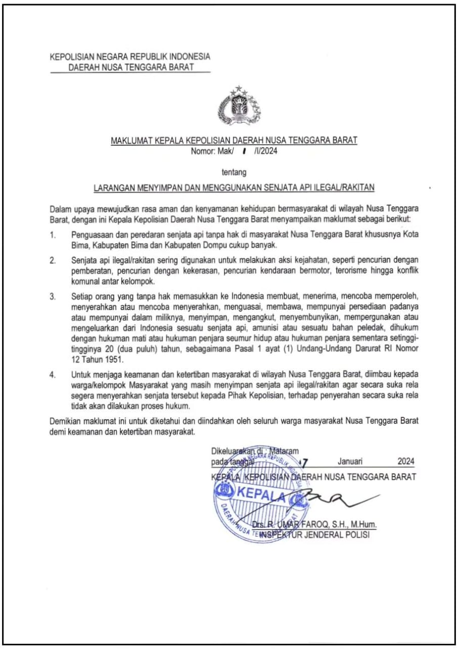 Maklumat Kapolda NTB Irjen Pol. Drs. R. Umar Faroq SH.M.HUm Tentang Senjata Api Ilegal/RAKITAN diwilayah hukum POLDA NTB