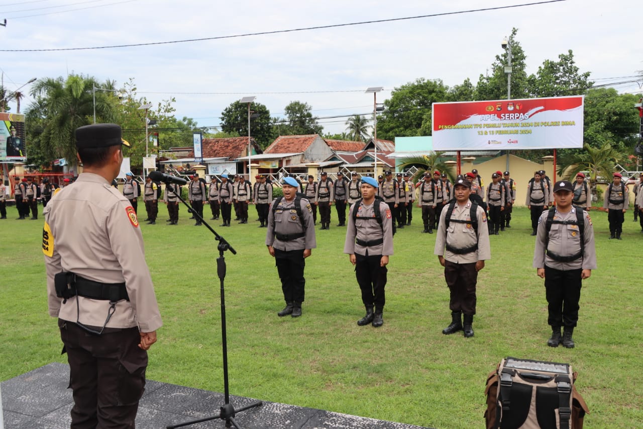 Bima, NTB (15/2) – Kapolres Bima AKBP Eko Sutomo SIK., MIK., diwakili Wakapolres Bima Kompol Saogi Sujana Angsar memimpin apel pergeseran pasukan pengamanan Tempat Pemungutan Suara (TPS) dalam rangka menjaga ketertiban dan keamanan selama proses Pemilihan Umum di Kabupaten Bima.