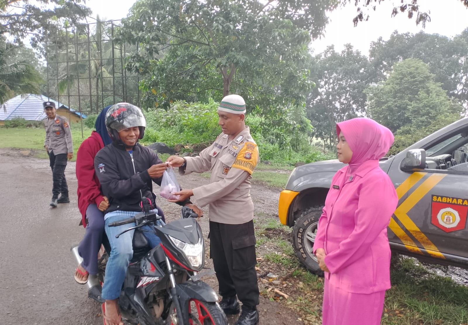 Lima puluh bungkus takjil berbuka puasa dibagikan secara gratis kepada masyarakat pengguna jalan serta warga sekitar Mapolsek Donggo.