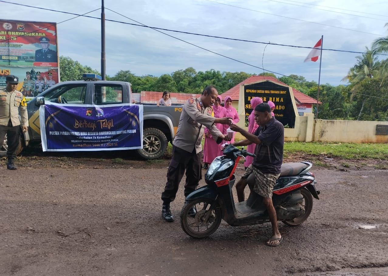 Bima, NTB (22 Maret 2025) – Menjelang Berbuka puasa Polsek Parado Polres Bima Polda NTB bersama pengurus ranting bhayangkari membagikan takjil kepada Masyarakat pengguna jalan