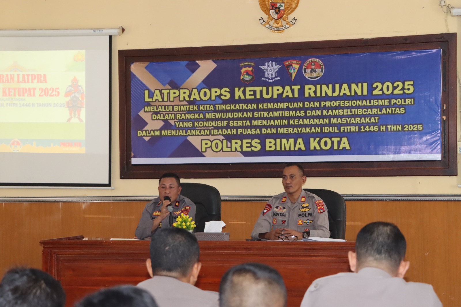 Kota Bima, NTB (26 Maret 2025) – Dalam rangka menjamin keamanan dan kelancaran perayaan Idul Fitri 1446 H, Polres Bima Kota menggelar Latihan Pra Operasi (Latpraops) Ketupat Rinjani 2025. Kegiatan ini dipimpin oleh Waka Polres Bima Kota, KOMPOL Herman, S.H., didampingi Kabag Ops Polres Bima Kota, AKP Dedy Supriyadi, S.H. Latihan ini dihadiri oleh Pejabat Utama (PJU) Polres Bima Kota serta seluruh personel yang terlibat dalam Operasi Ketupat Rinjani 2025. Acara berlangsung di Aula Rupatama Polres Bima Kota pada Selasa (25/3/2025).