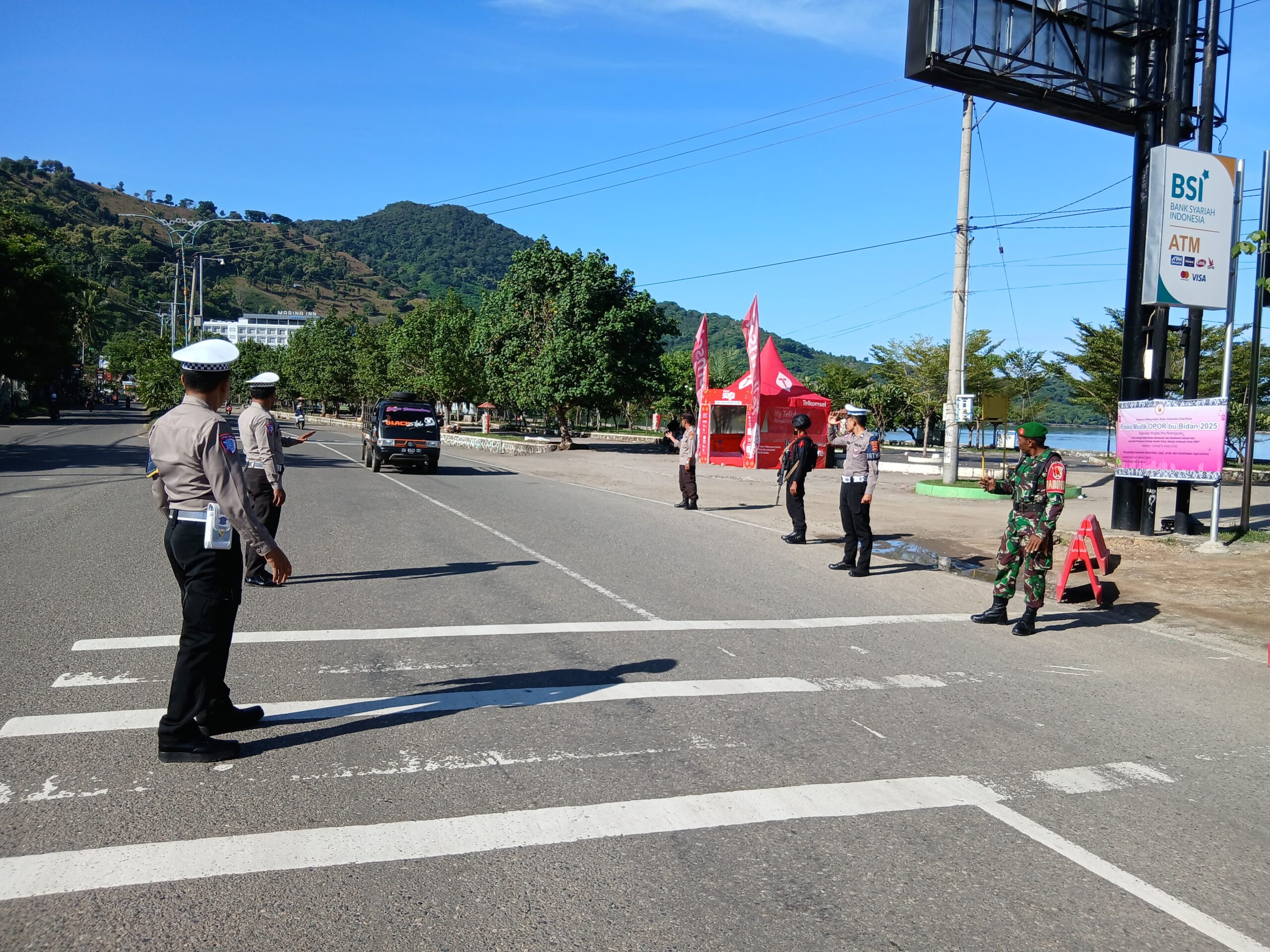 Kota Bima, NTB (2 April 2025) – Dalam rangka mendukung kelancaran arus lalu lintas selama pelaksanaan Operasi Ketupat Rinjani 2025, anggota Pos Pengamanan (Pos Pam) Amahami melaksanakan pengaturan lalu lintas di depan Pos Pam Ops Ketupat Rinjani, yang berlokasi di Jalan Jalur Bima-Sumbawa, Kelurahan Dara, Kecamatan Rasanae Barat, Kota Bima, pada Rabu, 2 April 2025, pukul 08.30 WITA.