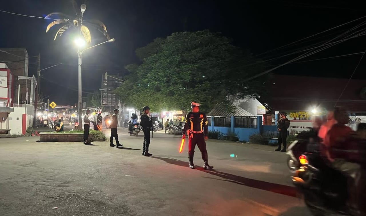 Bima, NTB (6 April 2025) – Cegah kemacetan, Personil Pos Pam  Operasi Ketupat Rinjani 2025 Simpang 3  Tente Polres Bima Polda NTB melaksanakan pelayanan penjagaan pengaturan (Gatur) lalu lintas malam hari.