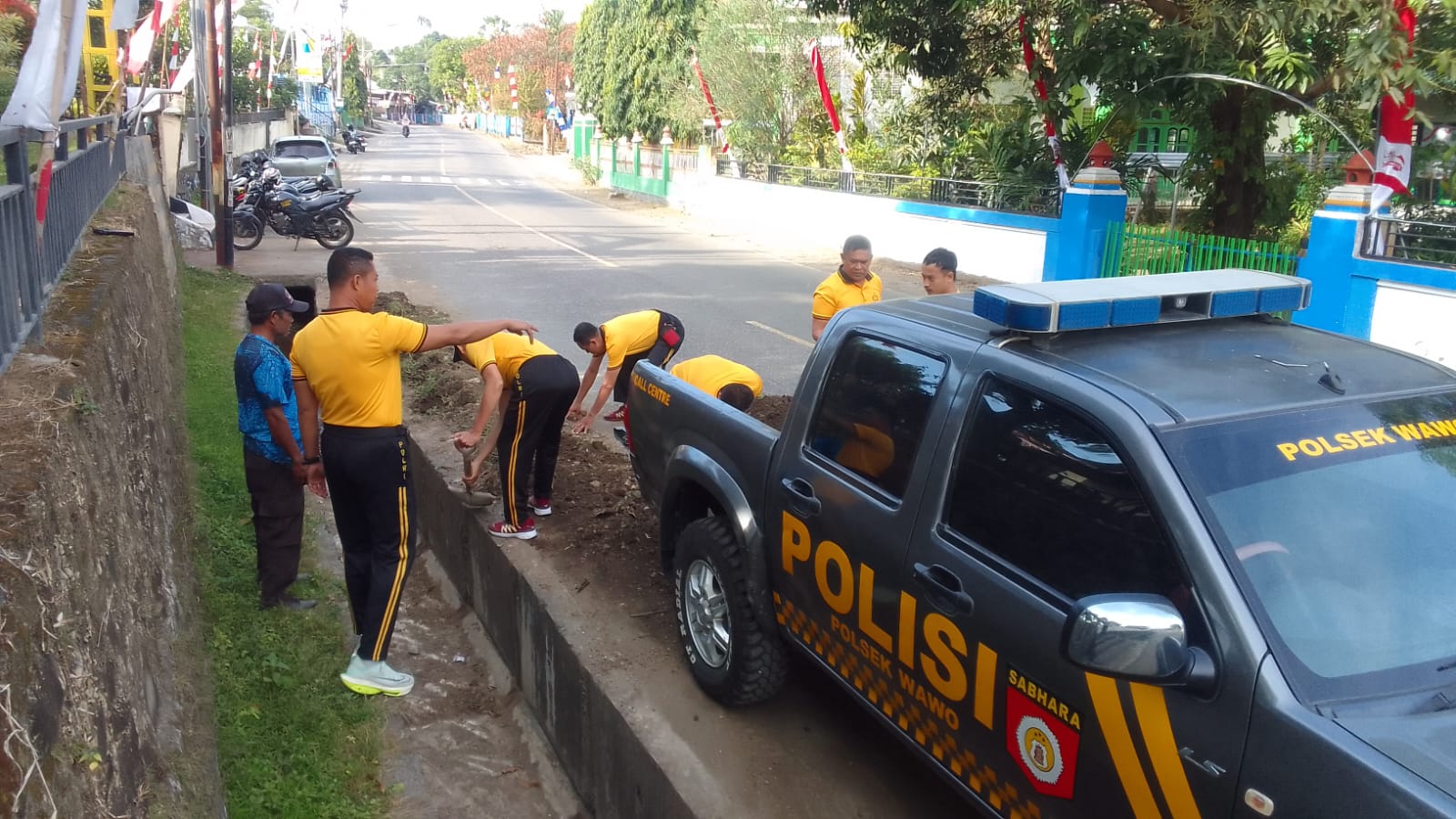Kegiatan tersebut dipimpin langsung oleh Kapolsek Wawo dan melibatkan seluruh personel yang dengan semangat bahu membahu membersihkan area sekitar Mako, termasuk membuang tanah dan lumpur dari saluran air agar tidak terjadi penyumbatan yang dapat menimbulkan genangan saat hujan.