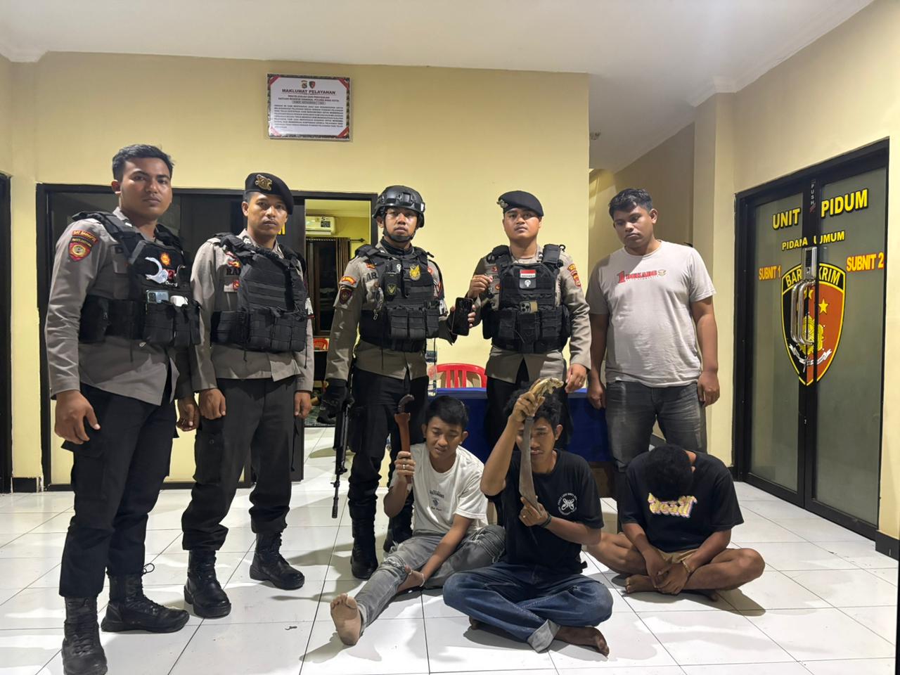 “Anggota Regu 3 Unit Turjawali Sat Samapta segera menuju lokasi setelah menerima laporan. Sesampainya di TKP, petugas langsung mengamankan tiga orang terduga pelaku beserta barang bukti dua bilah parang,” ungkap Ipda Baiq Fitria.