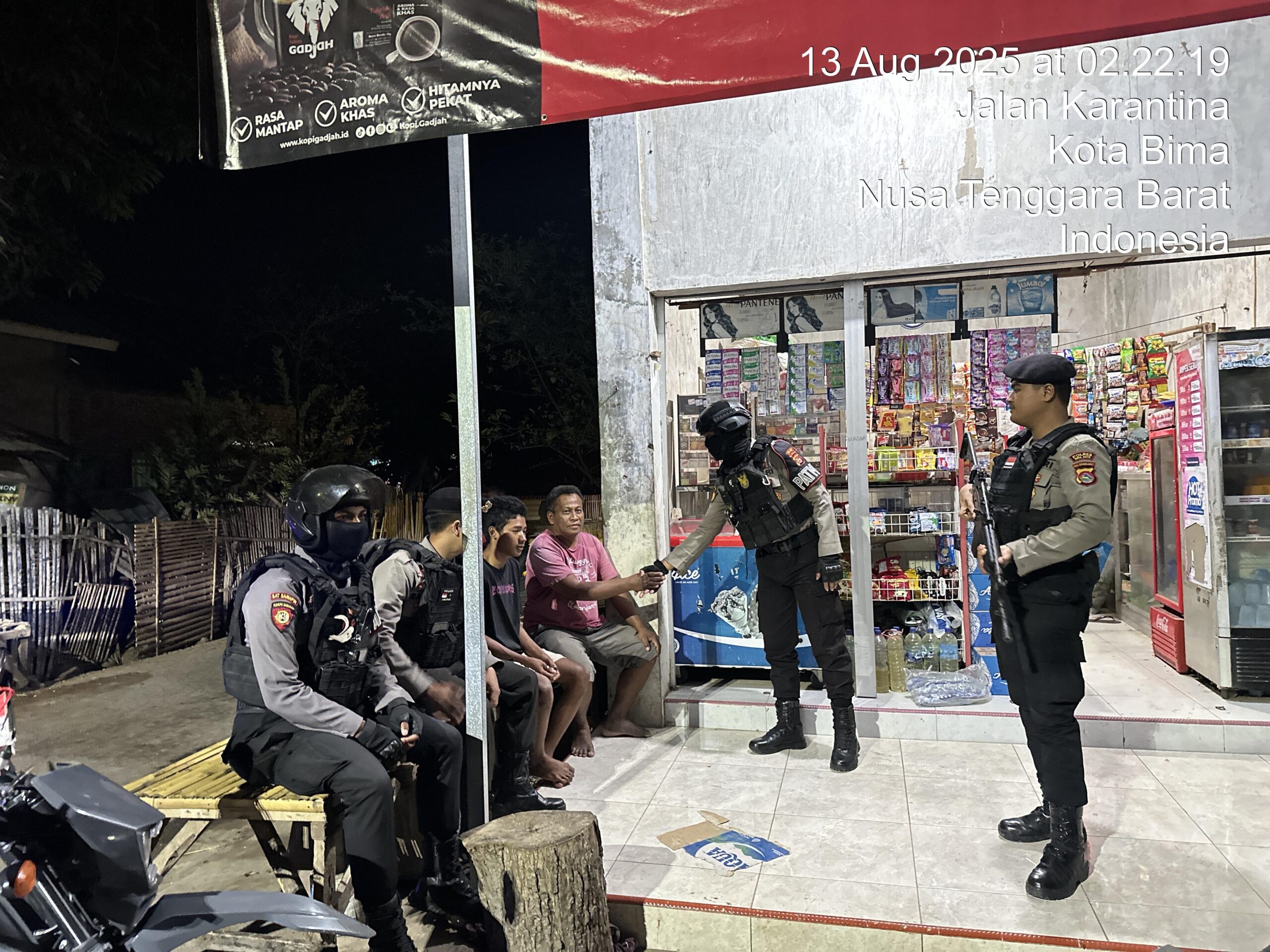 Kota Bima, NTB (13 Agustus 2025) – Sat Samapta Polres Bima Kota melaksanakan patroli malam guna mengantisipasi terjadinya tindak pidana 3C (curat, curas, dan curanmor) di wilayah hukumnya, Rabu (13/7/2025) pukul 02.00 WITA. Patroli menyasar dua titik lokasi, yakni wilayah Lewi Jambu dan BTN Tambana Kota Bima.